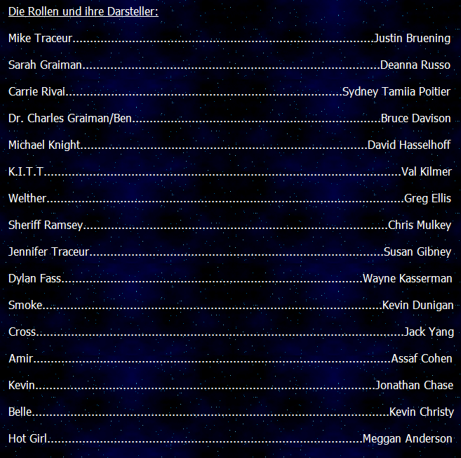 Die Story: Eine Söldnertruppe verschafft sich Zugang zum Haus von Dr. Charles Graiman, der für die US-Regierung am Projekt Prometheus arbeitet, das den Zugriff auf sämtliche satellitengesteuerte Raketensyteme erlaubt. Als sie ihn und seine Festplatten entführen wollen, erleidet der Wissenschaftler einen Herzinfarkt und stirbt. Als sie sein Haus leerräumen, entdecken sie die Überreste des Knight Industries Two Thousand und ein völlig neues Auto, das plötzlich von selbst startet und ihnen davon fährt. Das Ziel des Autos, bei dem es sich um den Knight Industries Three Thousand handelt, ist die Tochter von Dr. Graiman, Sarah, die an der Stanford-Universität in Kalifornien lehrt. Bei Dr. Graiman handelt es sich nämlich um den ursprünglichen Erfinder von K.I.T.T., der in das neue Modell ebenfalls Prometheus eingebaut hat. Bei diesem Projekt hatte ihm Sarah geholfen. Daher machen sich auch die Söldner auf den Weg zu ihr, da die junge Frau ihre einzige Hoffnung ist, die Schutzcodes des Programms zu knacken. K.I.T.T. erreicht Sarah gleichzeitig mit den Söldner und kann sie vor ihnen retten. In einer halsbrecherischen Verfolgungsjagd kann K.I.T.T. die Gangster abhängen und sucht nun gemäß seines Notfallprogramms den Kontakt zu Mike Traceur, den Sohn von Michael Knight (was dieser jedoch nicht weiß). Mike befindet sich in Las Vegas, wo er in einem Casino verzweifelt versucht, 90000 $ zu gewinnen, die er einem Gangster schuldet, der ihn umbringen will, falls Mike ihm nicht bis Mitternacht das Geld zurückzahlt. Mike und Sarah wuchsen zusammen auf und waren kurz ein Paar, bis Sarah nach Stanford ging und Mike zur Armee. Als Sarah ihn im Casino antrifft, sind auch schon die Söldner da. Obwohl Sarah Mike ihre Situation schildert, will er ihr erst nicht helfen. Erst als Sarah ihm die Begleichung seiner Schulden anbietet und beide von den Söldnern angegriffen werden, willigt er ein. Wiederum mit K.I.T.T.s Hilfe gelingt es den beiden, den Mördern zu entkommen. Mittlerweile hat der Tod Dr. Graimans die FBI-Agentin Carrie Rivai auf den Plan gebracht, die den Wissenschaftler sehr gut kannte. Sie findet heraus, daß es sich bei der Leiche, die man für Dr. Graiman hielt, um dessen Body-Double Ben handelt. Daraufhin macht sie sich auf die Suche nach ihm. Dr. Graiman flüchtete durch die Wildnis zu der Blockhütte von Jenny Traceur, Mikes Mutter. Die wehrhafte Frau hilft ihm bei seiner Flucht, und beide verstecken sich in einem Motel, von wo aus er K.I.T.T. und damit Sarah und Mike kontaktiert, ebenso wie Agentin Rivai. Diese arbeitet mit dem lokalen Sheriff zusammen, der jedoch mit den Söldnern unter einer Decke steckt. So kommt es, daß alle fast gleichzeitig bei dem Motel ankommen, in dem sich Charles und Jenny versteckt halten. Es kommt zum Kampf, wobei Mikes Mutter Jenny tödlich verletzt wird. Bevor sie stirbt, kann sie ihrem Sohn aber noch verraten, daß Michael Knight sein Vater ist. Die Söldner entführen Charles und werden von Mike und Sarah in K.I.T.T. verfolgt. Dabei kommt es zu einem Unfall, bei dem ihr Truck völlig zerstört wird. Charles überlebt den Unfall um Haaresbreite. Einige Tage später, auf der Fahrt zu Jennys Beerdigung, erklärt Charles, daß er in Zusammenarbeit mit dem FBI die Foundation wieder ins Leben ruft. Er bietet Mike die Position des Außenagenten - und damit K.I.T.T.s Piloten - an, doch Mike lehnt ab. Nach der Beerdigung trifft Mike auf dem Friedhof Michael Knight, der von Mikes Absage erfahren hat. Er erzählt ihm von Wilton Knight, der ihm einst auf dem Sterbebett sagte, daß ein Mann allein etwas bewirken kann, und daß er damals dieser Mann war. Als sich ihre Wege wieder trennen, fragt Mike seinen Vater, ob sie sich wieder sehen, und Michael antwortet: "Das hoffe ich." Durch dieses Gespräch inspiriert nimmt Mike doch noch den Job bei der Foundation an, wo er nun mit Charles, Sarah, Carrie - und natürlich K.I.T.T. zusammenarbeitet. Schon haben sie Hinweise zu dem Auftraggeber des Söldnerteams bekommen. Mike steigt in K.I.T.T. ein und zusammen brausen die beiden los…