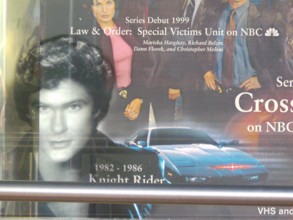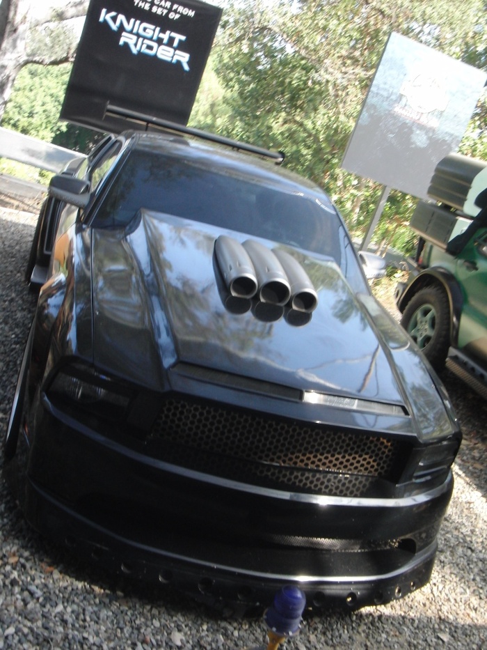 Ende September besuchte ich wieder einmal die Universal Studios in Los Angeles. Dabei darf natürlich die Studio-Tour nicht fehlen, bei der man durch normalerweise unzugängliche Areale und Schauflächen kutschiert wird. Da ich wusste, dass man dabei auch Autos aus Film und Fernsehen zu sehen bekommt, hielt ich meine Kamera schussbereit. Und da war er dann – zwischen einem Gleiter aus SERENITY und einem Geländewagen aus JURASSIC PARK – K.I.T.T.! Und zwar der neue. Wenigstens war er noch gut in Schuss, aber ich würde ihn lieber auf der Straße sehen, bei den Dreharbeiten für neue Folgen…