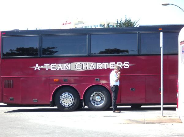Und diese Aufnahme hab ich ebenfalls während meines USA-Besuchs letzten Monat gemacht. Es handelt sich um einen Reisebus, der auf einem Parkplatz in Monterey/Kalifornien stand. Der Van reicht dem A-Team wohl nicht mehr…?